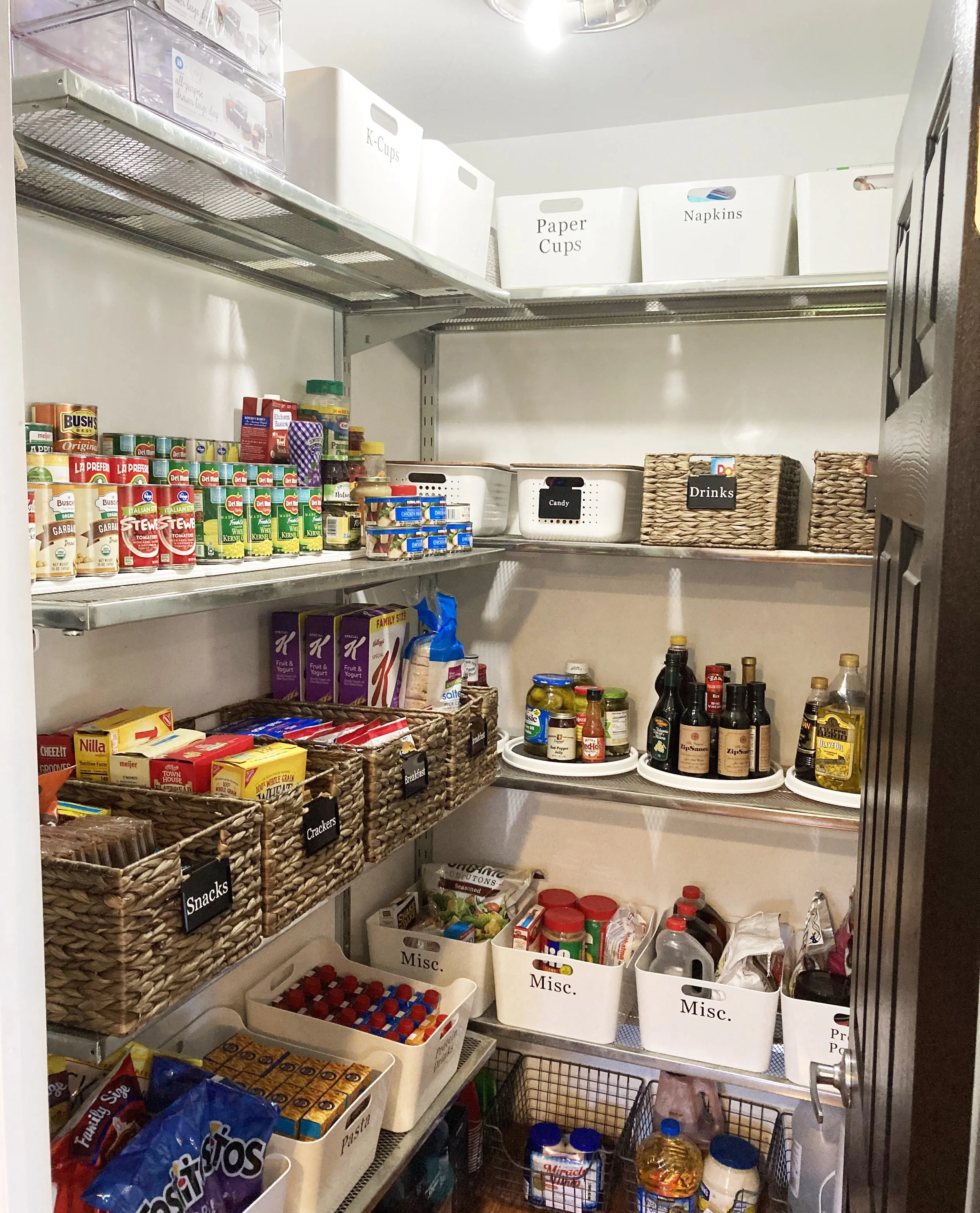 Labels are a small detail that will make a big impact! Whether you use a label maker, blank stickers or a simple sharpie and tape, labeling your containers and shelves will keep everyone in the household on the same page. No need to wonder where all those cookies and granola bars disappear to.